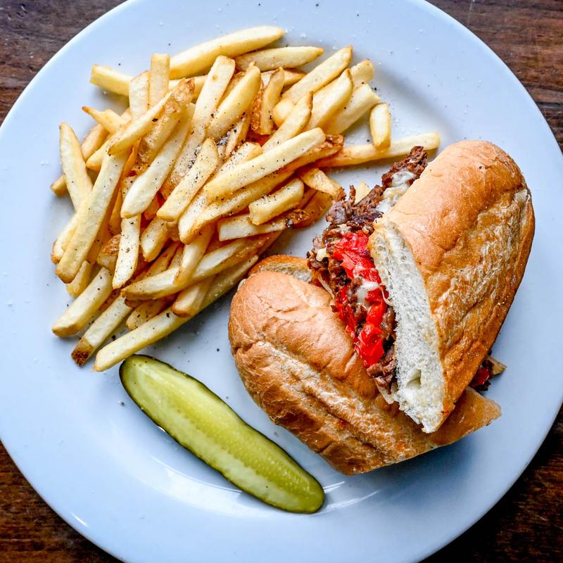 Thinly sliced steak with peppers and onions smothered in american cheese on a griddled roasted garlic butter sub roll. Served with fries.