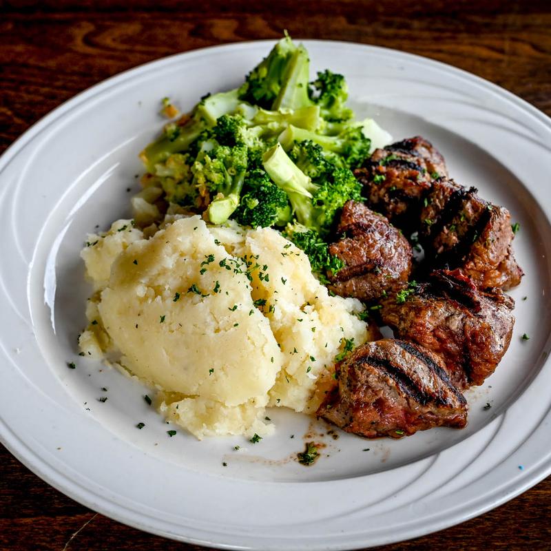 Hamilton steak tips with two eggs any way, home fries, and toast.